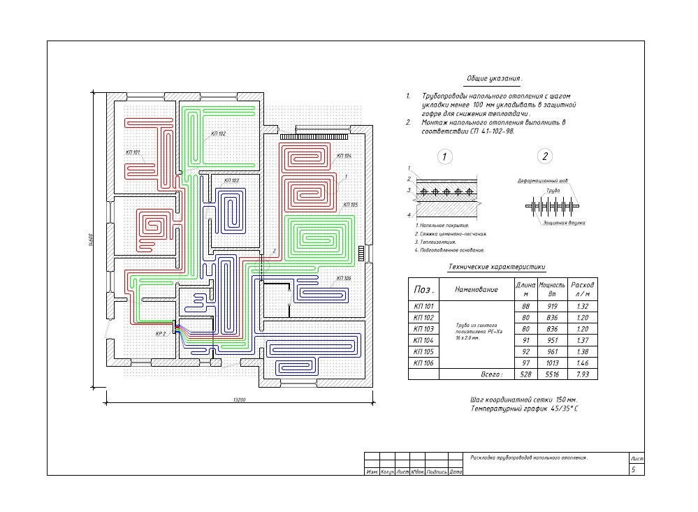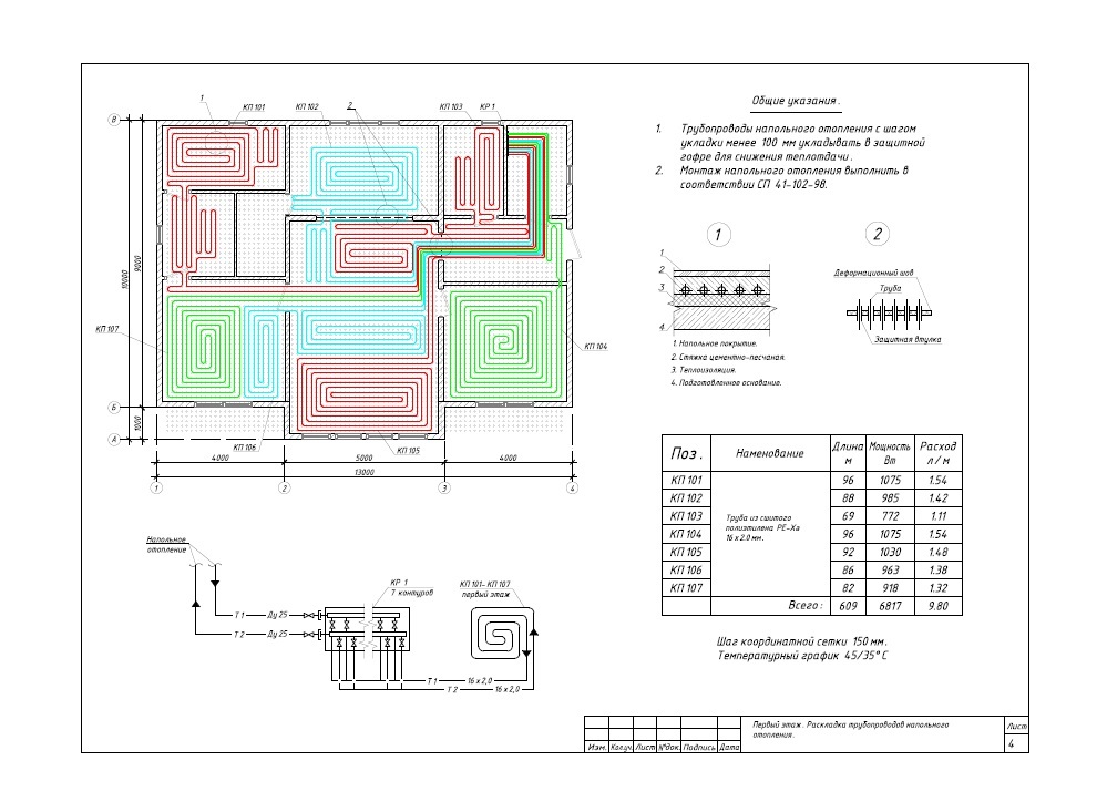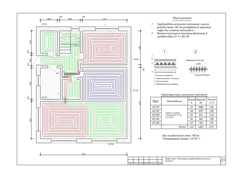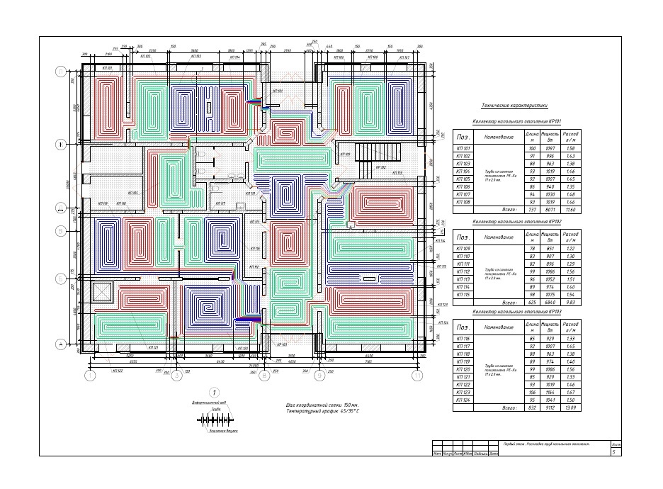 Раскладка трубопроводов теплого пола по координатной сетке с заданной длиной контура. Расчет мощности напольного отопления в зависимости от площади, типа финишного покрытия, качества стяжки, толщины утеплителя и шага укладки. Построение монтажной схемы теплого пола в одном уровне с учетом краевых зон, деформационных швов, планировки помещений. Предварительный расчет количества и длины контуров в зависимости от площади напольного отопления и шага укладки трубопроводов. Гидравлический расчет для подбора циркуляционного насоса, регулирующих вентилей распределительных коллекторов.